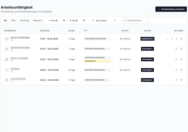 Krankmeldungen und Abwesenheiten digital erfassen, dokumentieren und automatisch mit der Zeiterfassung verrechnen....