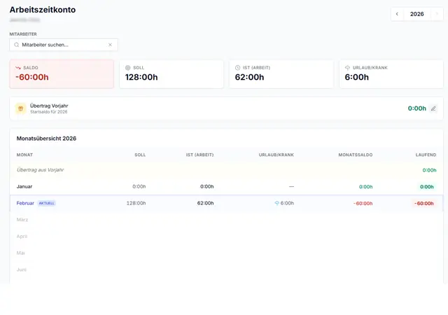 Soll/Ist-Vergleich der Arbeitszeiten, Überstundensaldo und automatischer monatlicher Übertrag....