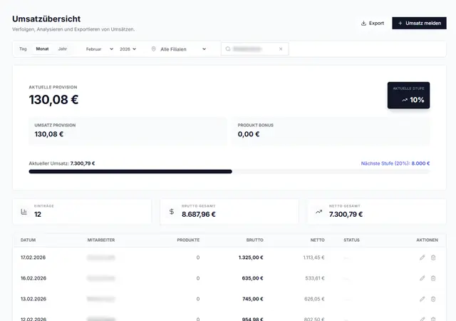 Tagesumsätze erfassen, Provisionen automatisch berechnen und Performance-Berichte generieren....